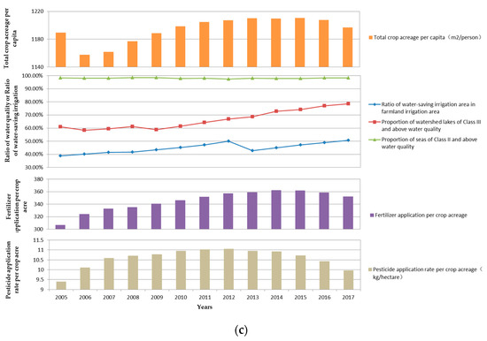 (ii) Intensity of agricultural chemistry: Fertilizers and pesticides were originally applied in agriculture as an external supply means for agricultural production so as to increase the yield [30]. However, due to the hazards that they bring to agricultural resources, the environment, and food safety, they were defined as negative indexes in the evaluation system of sustainable development [31,32]. Therefore, this paper selected fertilizer application rate per crop acre and pesticide application rate per crop acre as two indexes.
