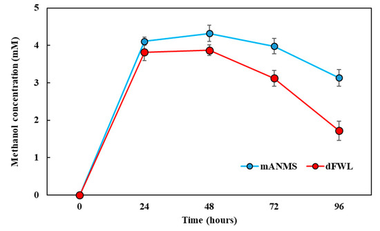 3.3. Methanol Production from Digested FW Leachate by Methanotrophs