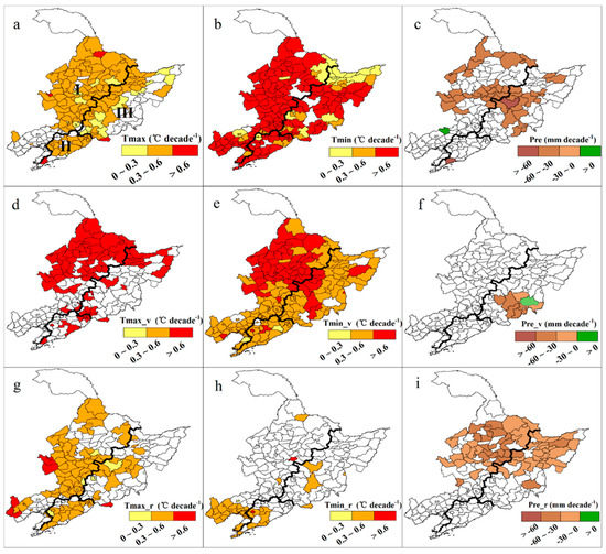 Spatial distribution of the trends in maximum temperature (Tmax), minimum temperature (Tmin) and precipitation (Pre) over the period 1980–2010. (a–c) show the trends for the time window of whole-season; (d–f) show the trends over the vegetative phase in the time window of vegetative and reproductive (V&R); (g–i) show the trends over the reproductive phase in the time window of V&R. Only the counties with significant trend (p < 0.05) are presented. The three regions are expressed by I, II and III, respectively. The bold black lines show the region boundaries.
