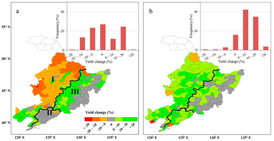 When climate change at V&R phases was taken into consideration, however, maize yield was found to have increased in 81% of the 190 counties. No significant change occurred in the eastern edge of NEC, and only 4% of all counties showed yield reduction due to climate change (Figure 2b).