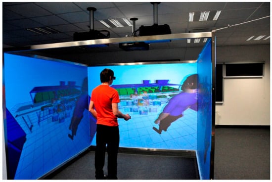 - CAVE (Computer Assisted Virtual Environment)—projects images on the wall, floor and ceiling. In the room, so called cave, the user must wear special glasses and his movement is limited to a selected area, made of walls, as can be seen in Figure 1. The main advantage of CAVE is a possibility to share experiences. The main disadvantage is the cost and space requirements for this display device [].