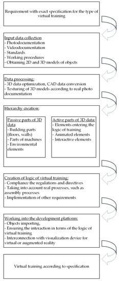 Making of virtual training has its procedure, which is shown in Figure 2. It is implemented in a selected platform. There are several platforms, which could be used at universities, and 3D Unity, Unreal studio, and the Ella platform are the most commonly used platforms in Slovakia.