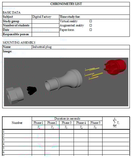 First group of students monitored when assembling an industrial plug was given a user manual, as it can be seen in Figure 5. None of the elements of virtual reality were used. Each time duration for operations Phase 1—Phase 5 was written down in the chronometry list and evaluated afterwards.