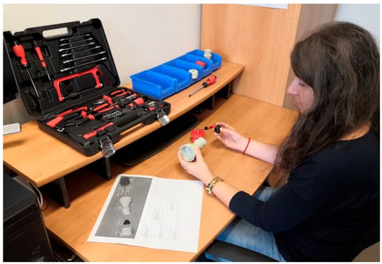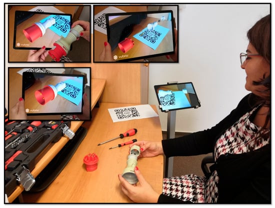 A second group of students monitored when assembling a socket was given a manual with the use of augmented reality, as can be seen in Figure 7. Each step of the assembly procedure was displayed in augmented reality on a tablet. Each time duration for operations Phase 1—Phase 5 were written down in a chronometry list and evaluated afterwards.