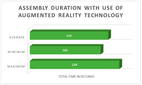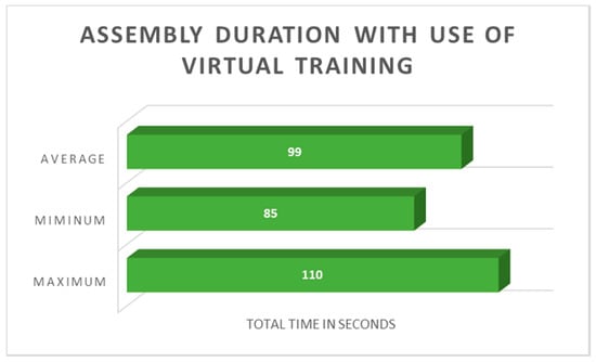 Results achieved (with maximum and minimum assembly time duration) from the measured data for statistic sample of thirty students are shown in Figure 10. This implies that the total time needed for an industrial plug assembly with the use of virtual reality and virtual training is an average of 99 s. The average time compared to a user manual was reduced by 78 s and in the case of augmented reality was reduced by 14 s.