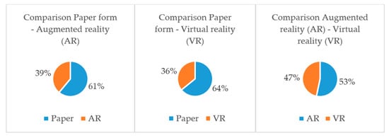 The analysis points out that the use of augmented and virtual reality significantly reduces the time needed for industrial plug assembly. The most significant difference can be seen when comparing the time needed for assembly with user manual (paper form) and virtual training. There is also a difference between the use of augmented and virtual reality, but it is not as significant. Therefore, it is not possible to decide what technology is more efficient, even though the total time needed for assembly with virtual reality was reduced by 12.39%, compared with the augmented reality. Moreover, the technology of augmented reality also belongs into the category of virtual reality, that is why it is possible to consider them both equally [].