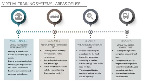 Technological processes and equipment are closely linked to industrial risks. This is a process of assessing the projected decline to a satisfactory level and continuously monitoring the risks for organizations []. It is possible to help manufacturing and non-manufacturing organizations or specialists with the support of virtual and augmented reality applications. It is very important to find solutions using new and effective approaches []. Industrial virtual training could be divided into several areas. This could be seen in Figure 13.