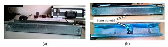 For the studied material and part, the LGS profile, there were at least two challenges: Low carbon content (for the hardening) and low thickness (for the depth penetration). This is why the first experiments were not encouraging at all as the profile had been burned in the zones where the induction process was taking place—see Figure 4.