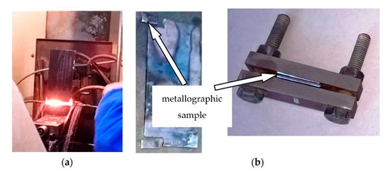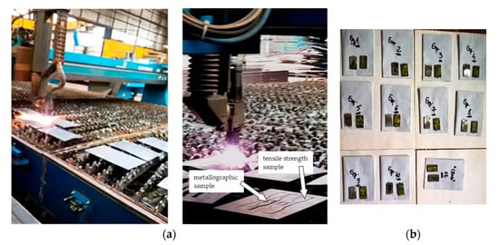 The specimens for the metallographic analysis (and the standard specimens for determining the tensile strength) were obtained by plasma flame CNC cutting—see Figure 8 (plasma flame process and specimens).