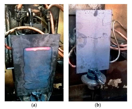 Induction hardening process of S235 material, 3.0 mm thickness; (a) induction hardening process image, (b) samples for metallographic analysis.