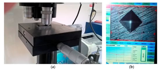 This 1 kgf (kilogram force) was considered adequate, due to the material’s characteristics and thickness. The lower loading does not ensure the penetration depth into the whole hardened layer, while the higher loading generates the deterioration of the hardened layer by penetration into all the material’s thickness. The images and results obtained are presented in Figure 10 (the measuring process and penetration print).