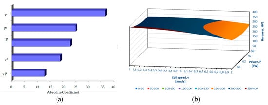 The Pareto chart of coefficients evidences how strong the influence of each input variable and their interactions are on the output variable. The 3D surface is the one that points out the variation of the surface hardness HV1 on the induction process parameters, P and v.