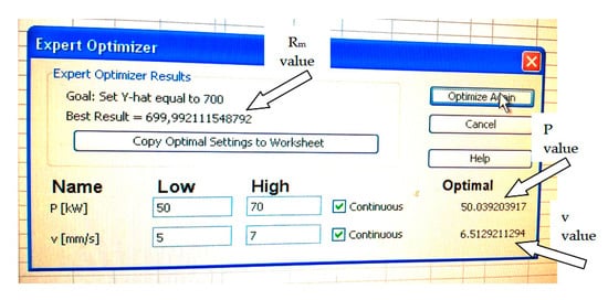 The above-mentioned values for P and v were determined by the tensile strength regression model—Equation (3) determined in [] and, further, by the DOE KISS software Expert optimizer module—see Figure 12.