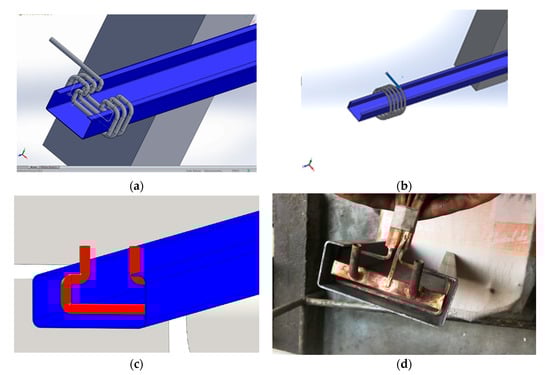 Induction coil type for the LGS profiles; (a) induction coil surrounding the entire LGS profile section; (b) circular exterior induction coil; (c) interior induction coil for the LGS profile section; (d) interior induction coil and the LGS profile.