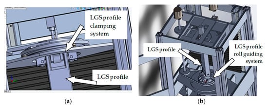 Another aspect considered was that of minimizing the thermal deformation resulting after the induction process. That is why a system for clamping the profile and continuously guiding it through all the induction process time was designed—see Figure 14. This system is part of a piece of equipment that could be used with a mobile high frequency current generator (see also []) directly in the production hall of the LGS profile manufacturer [].