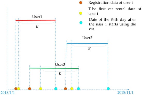 As shown in Figure 5, despite having various starting times, the observation periods of all users have the same duration. The car usage characteristic variable for each user is initially determined, and then the car-sharing usage behavior characteristics in different observation periods are separately examined. The user with the assessment period duration K is then classified and predicted, and the prediction accuracy is eventually determined. This process is described in detail as follows.