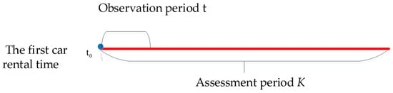 Observation period: The observation period refers to the period when car-sharing companies observe the behavior of its users. In other words, the observation period represents a short period from the first time the user uses a car to the following. The observation period data for each user are fully known, including his/her car-sharing usage behavior and expenditure amount. The assessment period can be predicted by using the characteristics of the user during the observation period. A longer observation period can help companies understand the car-sharing usage behavior of their users and accurately predict their type during the assessment period. However, a longer observation period also introduces a higher time cost, which is not conducive for companies to understand the preferences of their users as soon as possible. Therefore, a shorter observation period is ideal under the premise of satisfying the prediction accuracy threshold. The duration of the observation period defined in this research is denoted by t.