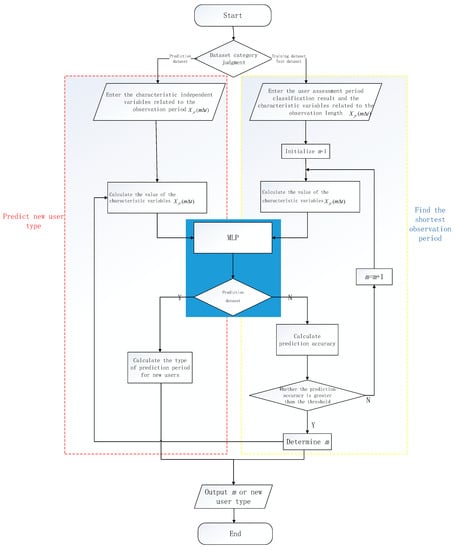 The multi-layer perceptron model can achieve two goals, namely, determine the duration of the observation period and predict the type of new users without a classification label. The shortest observation period is determined by using a specific accuracy threshold. The modeling process is shown in Figure 3.