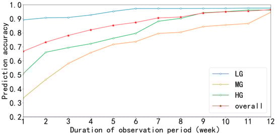 Table 8 presents the prediction results for the first 6 weeks and the 12th week (the duration of the observation period is equal to the duration of the assessment period). The curve of the prediction accuracy calculated from the 12-week observation period is shown in Figure 6.