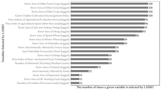 This section presents and discusses the set of variables that were selected by LASSO. The variable-selection procedure involves two steps. In the first step, a Hausman specification test [] was performed to choose a suitable empirical specification for the LASSO estimating model. The need to perform such a test stems from the concern that even though a large number (i.e., 76) of potential explanatory variables are available in our dataset (Table 1, column 1), there might still exist unobserved factors (e.g., land quality and farmers’ farm management skills) that affect green fodder supply in China; the potential correlation between these unobserved factors and the explanatory variables in our model may lead to biased estimates of the parameters []. Thus, given the panel structure of our dataset, whether one should use a fixed-effect specification to control for these fixed unobserved factors or one may adopt a random-effect specification that treats the unobserved factors as random errors, can be advised by the results of the Hausman test. Since the results of the Hausman test (Chi-sq = 4.251, p-value = 0.236) are in favor of a province-level random-effect model, we performed LASSO based on a random-effect specification to select relevant variables from the original set.