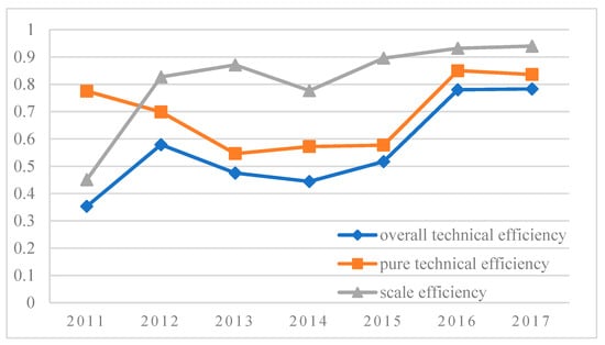 Overall technical efficiency of the PV power generation industry in China, 2011–2017. (Source: Own elaboration.)
