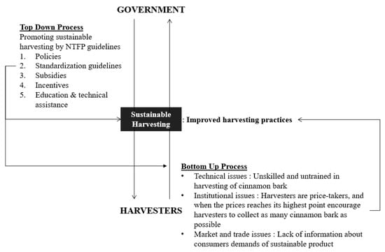 Based on the conceptual framework, a multistakeholder approach should address a better practice of sustainable harvesting. The bottom-up process, with assistance from the Assessment Institute for Agricultural Technology (BPTP) and the Forest Management Unit (KPHP), can educate harvesters to adopt sustainable harvesting practices.