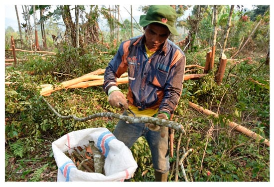 In other areas of the surrounding TNKS, Batang Merangin, a similar integrated approach has been promoted by Rikolto (Belgium based non-profit organization) where the harvesters were previously clear-cutting the slopes of the park, resulting in severe soil erosion. In return for agreeing to use organic and sustainable harvesting practices, harvesters’ are now provided with training, support, and market outreach. Sustainable harvesting is the primary concern for BPTP which can be translated to provide a constant supply of cinnamon bark in Lempur by improved by harvesting methods. According to BPTP, clearcutting is not the appropriate platform for sustainable harvesting, and one of the indicators for harvesters is that they are more adequate in using their knowledge and capacities by interacting with the environment for the better compliance towards sustainable harvesting. Harvesters see the value price is higher when the tree reaches more than 15 years due to quality of the bark increasing with its age (n = 30). Interviewed harvesters consider prioritizing the amount of bark they can peel rather than the environmental impact it has. Peeling requires skilled labor, and the know-how of cinnamon peeling is handed down from generation to generation (n = 30). The clearcutting (“tebang habis”, in the local language) is the easiest way to cultivate the bark when the tree reaches ten years old, and it involves cutting down the whole tree, followed by peeling the bark (Figure 4).