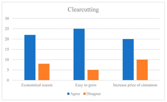 As for the reasons for choosing clearcutting, it depends on different kinds of factors. Based on Figure 6, 22 harvesters had chosen clearcutting due to economic reasons as cinnamon is the primary cash-crop for their livelihood. Clearcutting for the respondent was the most common and economically profitable method of getting the bark. Based on the 25 respondents (n = 30) mentioned that cinnamon is easy to grow (“rumput hutan”, the local language), which does not present any concern for replanting. The increasing gate-price of cinnamon bark is the reasons for 20 respondents to choose to clear cut rather than cultivating by height as can be noticed (Figure 6).