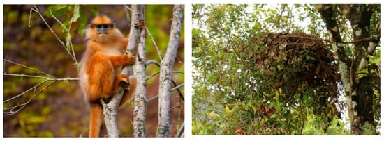 Wildlife living in the cinnamon trees (left: surili monkey, right: bear nest).