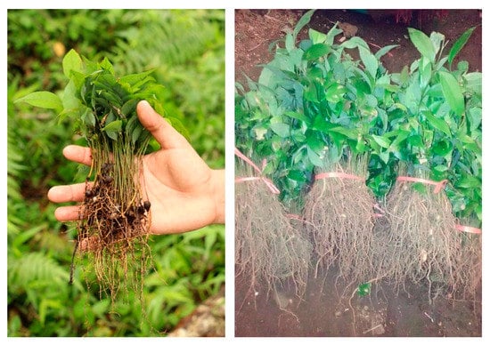 This nursery (Figure 13) is immediately given a canopy to prevent seedling death from direct sunlight. After the age of 6–8 months, the seeds can be transferred to the field. The spacing for cinnamon is 1.5 m × 1.5 m and 2 m × 2 m, while the “tumpeng sari” intercropping process is generally less frequent, i.e., with an area of 3 m × 3 m and 4 m × 4 m.