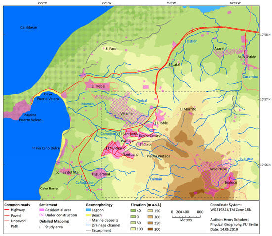 Location. The village of El Morro is located in a hilly landscape 15 km west of the city limits of Barranquilla, directly uphill of the coastal road to Cartagena (road number 90A). The road currently extends over four lanes [33]. The study area encompasses the villages of El Morro and of Juaruco at its margin. The area expands across the hill range and the subsequent coastal strip characterized by sandy areas and lagoons. Administratively, El Morro and Juaruco are each a corregimiento; this term is used in Colombia to define a subdivision of a municipality [34]. The village of El Morro is divided into the districts Camajarú, Barrio Centro, El Roble, El Latal, El Cielo, and El Morrito, and the corregimiento El Morro also includes the villages of Bajo Ostión, Puerto Velero, and Caño Dulce. Figure 1 depicts an overview of the study area in its current state with existing infrastructure, settlement areas, local labelling, and simplified relief [35,36,37]. The map section of Figure 1, with a total area of 40.15 km², also corresponds to the area discussed at the PGIS workshop in El Morro. A smaller 11.7 km² section around the villages of El Morro and Juaruco was used for the detailed land use mapping including the three gated community projects El Santuario, Jwaeirruku, and Velamar [38,39].