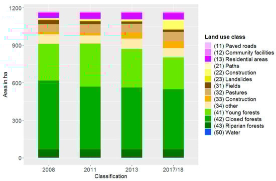 The visual interpretation of high-resolution satellite images combined with the on-site field mapping conducted in July 2018 resulted in four maps depicting land use in the years 2008, 2011, 2013, and 2017/18 (Supplementary Material, Figures S1–S4). The results of the area calculation of the four maps are depicted in Figure 2 and Table 3.