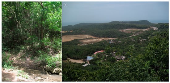 (a) Local spring in the tropical dry forest at the Cucamba drainage channel; and (b) Panoramic view of the village of El Morro. In the background, the Caribbean Sea, the coastal highway (90A), and on the left, the construction site of the Velamar gated community project (photos Schubert, July 2018).