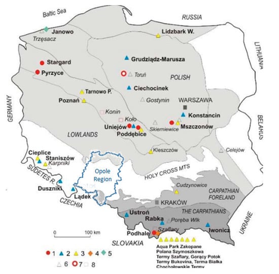 Geothermal installations in Poland, 2017:1-district heating plants, 2-health resorts, 3-recreation centers, 4-wood drying, 5-fish farming, 6-recreation centers in realization, 7-heating system at early stage, 8-some expected co-generation installations. Source: Kępińska 2019.