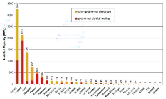 The above examples of applications of geothermal energy shows that Poland only has a few examples of geothermal water applications compared to Europe at large. The combined heat and power plants in Poland operate on a small scale, according to data from the European Geothermal Congress 2016, in 2015, Poland was 12th in Europe in terms of installed capacity from geothermal sources among 30 countries covered by statistics. Figure 2 shows geothermal heating and other direct uses in Poland and other European countries []. In 2017, there were 294 heating systems in Europe, of which only 6 were in Poland [].