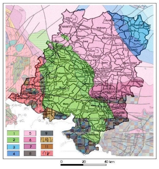 Opole Province—geological map without Cenozoic work. 1-Late Cretaceous (Coniacian, Santonian); 2-Late cretaceous (Cenomanian, Turonian); 3-Middle Jurassic; 4-Lower Jurassic; 5-Upper Triassic; 6-Middle Triassic; 7-Lower Triassic; 8-Upper Carboniferous; 9-Lower Carboniferous; 10-Late Devonian and Lower Carboniferous; 11-Early and Middle Devonian; 12-Late Proterozoic—Ordovician. Source: Study For The Development Of Energy Systems In Opolskie Voivodeship 2015.