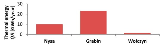 The results obtained for the three locations allow analysis of possible district heating with heat energy from existing thermal wells. Grabin is a small village with about 160 households. Considering that the heat energy obtained from the thermal intake in this town could cover the demand for heat energy for about 770 households, the obtained energy exceeds the demand of the village by almost 5 times. For the city of Nysa, it was calculated that nearly 3% of approximately 11,000 households could only obtain thermal energy from a thermal source. For the slightly smaller city of Wołczyn, the heat energy obtained from the well could cover, as in the case of Nysa, about 3% of the number of households. At present, there are no investors who would deal with the construction of such heat and power plants, which is due to the long reimbursement period of investment costs. However, given the trends prevailing in Europe and in the world and at the same time the need to search for “clean” energy sources, the possession of such large resources of thermal waters is good for Poland (70–80% of the country).