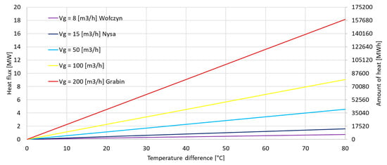 When we relate the three sources discussed in the chart on Figure 6, it can be observed that the heat flux received from Wołczyn has the smallest efficiency for heat production, whereas one could expect a high amount of heat in Grabin. As described by other authors, the most favorable option is the extraction and energy management of waters lying at a depth not exceeding 2000 m, with a temperature above 65 °C and salinity not exceeding 30 g/dm3 [,]. The thermal energy from thermal waters could be used in public and multi-family buildings for district heating and could replace coal frequently used for building heating systems in Poland. The utilization of geothermal energy system benefit in the conservation of fossil fuels and reduction in emission of such pollutants as CO2, SO2, and NOx.
