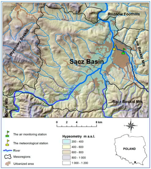 The area of the Sącz Basin and location of the air monitoring station and the hydrological and meteorological station in the Sącz Basin.