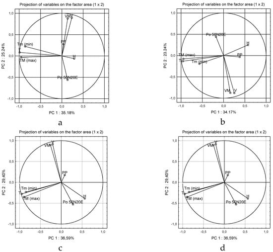 Projection of significant meteorological elements on the principal components area (1x2), PC1, PC2 in calendar seasons: spring (a), summer (b), autumn (c) and winter (d) (2006–2016).