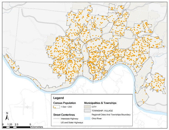 The study area of this research is the City of Cincinnati, the core of the Greater Cincinnati Metropolitan Area. Cincinnati is within Hamilton County, OH. The University of Cincinnati is located in this city. Based on the data acquired from the Cincinnati Area Geographic Information System (CAGIS), the total area of Cincinnati is 206.01 km2, and this city is composed of 50 neighborhoods. In the year of 2013, the total population of this city was 297,444. Figure 1 shows the spatial distribution of the Census population by neighborhood. Since using choropleth maps for presenting counts is inappropriate and against the cartographic rules [43], we choose the dot density map to display the population. One dot represents 200 individuals, and the neighborhood with more dots has a larger population. This map is created with ArcGIS 10.4.1, so as to the other maps presented in this paper.