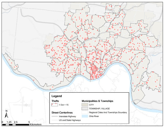 Dot density map for thefts by neighborhood in Cincinnati in 2013 (N = 11,742).