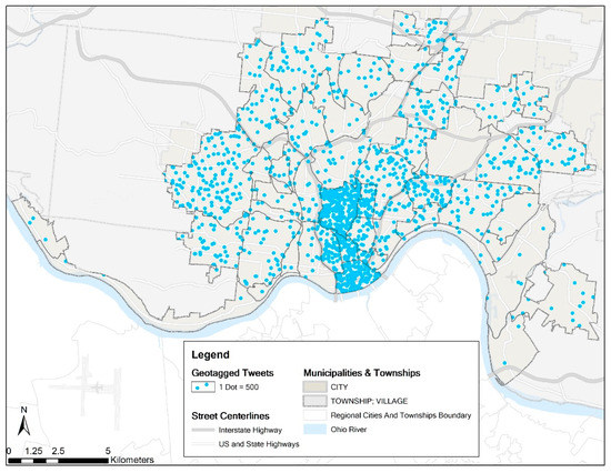 Dot density map for geotagged tweets by neighborhood in Cincinnati in 2013 (N = 778,901).