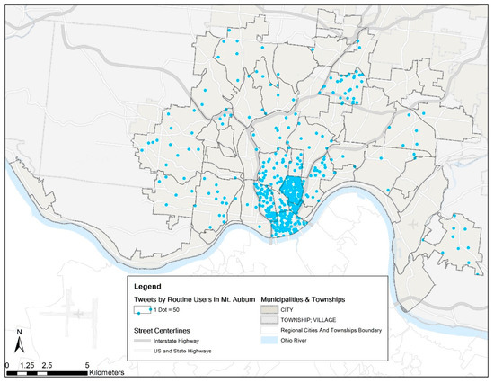 Dot density map for geotagged tweets of the 35 routine users in Mount Auburn by neighborhood in Cincinnati in 2013 (N = 26,812).