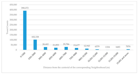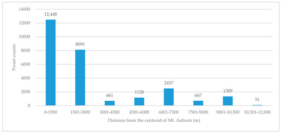 To further highlight the distance decay pattern, we also calculate these tweets’ Euclidean distance to the centroid of Mount Auburn by using ArcGIS 10.4.1. Since the dimension of Mount Auburn is about 1500 m, the interval of the bins for the histogram is set as 1500 m. Figure 5 shows the histogram of the tweets in each distance bin, demonstrating an obvious distance decay phenomenon of tweets. The revealed distance decay phenomenon serves as an empirical foundation for the hypothesis of the spillover effect of tweets on theft crime.