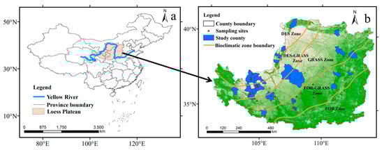 (a) Location of the Loess Plateau; (b) 21 sites for plant biomass sampling, 22 study counties, 5 bioclimatic zones: arid deserts (DES) zone, arid and semi-arid desert-grasslands (DES-GRASS) zone, semi-arid typical grasslands (GRASS) zone, sub-humid to semi-arid forest-grasslands (FOR-GRASS) zone, sub-humid forests (FOR) zone.