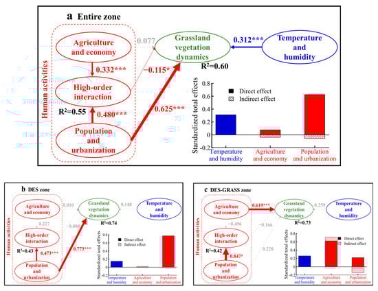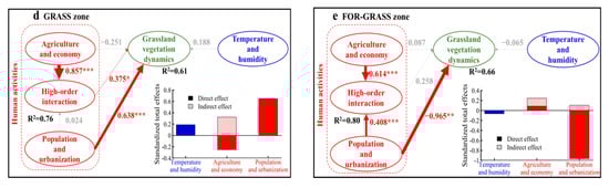 Over the entire study region (the union of the four bioclimatic zones), the increase in population and urbanization directly promoted the increase of grassland vegetation (Figure 3a). Population and urbanization showed the largest direct effect (0.625), followed by temperature and humidity (0.312) (Figure 3a). Agriculture production and economic development has no significant direct effect, but indirectly impacts the dynamics of grassland vegetation by interacting with population and urbanization in a significantly negative way. Similarly, the population increases and urbanization development could reduce the AGB and area of grassland vegetation indirectly when the interaction with agriculture and economic was considered (Figure 3a). Overall, the indirect effect of population and urbanization was far less marked than the direct effects.