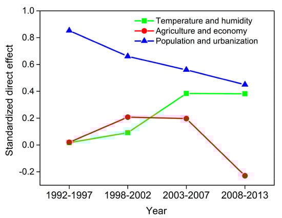 The direct effect size of population and urbanization was larger than those of the other driving factors (temperature and humidity, agriculture, and economy) in all time periods (Figure 4). The effect of population and urbanization decreased annually. On the contrary, the effect of temperature and humidity increased annually (Figure 4).