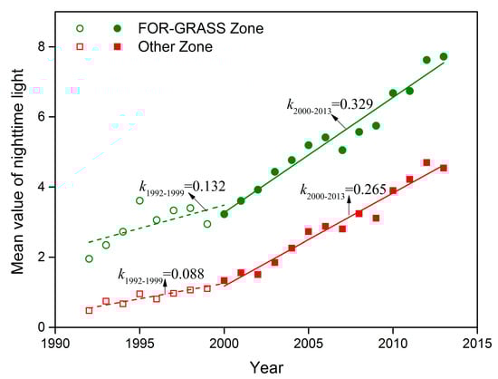 The mean value of NTL in the other three bioclimatic zones (deserts, desert-grasslands, and typical grasslands zone) was lower than that in the forest–grassland zone (Figure 5). Meanwhile, the increasing rate of NTL accelerated since the full implementation of the GFG in 2000.