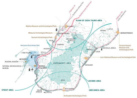 The Metropolitan City of Reggio Calabria [17,18,19,20,21,22] presents a complex territorial system with different areas and contexts from the morphological, settlement and economic development point of view [23]. It is the only Italian and European metropolitan city that includes a national park, the Aspromonte National Park, of over 65,000 hectares, which is one of the five homogeneous territorial areas identified by the Statute of the metropolitan city. The other homogeneous areas are the Plain of Gioia Tauro, the Strait, the Locride and the Grecanica areas (Figure 1). The metropolitan city of the Strait has an intimate link between Mediterranean coastal environments and mountain landscapes, with the Apennine ridge that continues into the Peloritani of the Sicilian side.